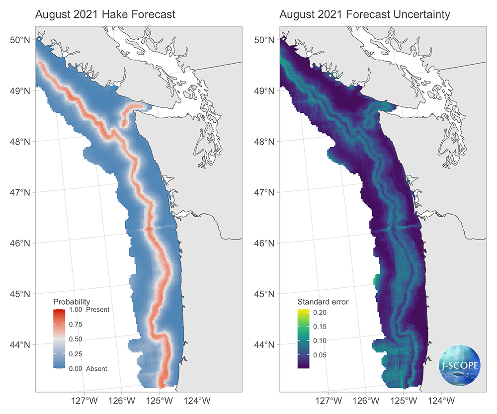 Right panel: Uncertainty associated with the Pacific hake forecast for August 2021. Forecast uncertainty is higher in locations with brighter colors (yellow) and lower for darker locations (dark blue). Uncertainty tended to be highest in areas just inshore and just offshore of the 200 meter shelf break.