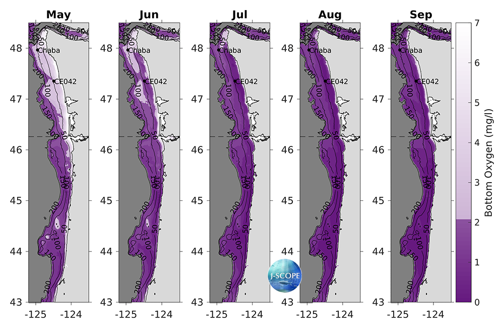 The modeled region bottom oxygen (mg/l) averaged over all three ensemble members and in time for (from left to right) May, June, July, August, and September. Hypoxia (O2 < 2 mg/l) is shown in dark purple, land is shown in light grey, and offshore areas are shaded dark gray. The black dashed line indicates the boundary between Washington and Oregon waters. Black contours indicate bathymetry on the shelf. Two mooring locations are plotted for reference (Ćháʔba·, CE042).