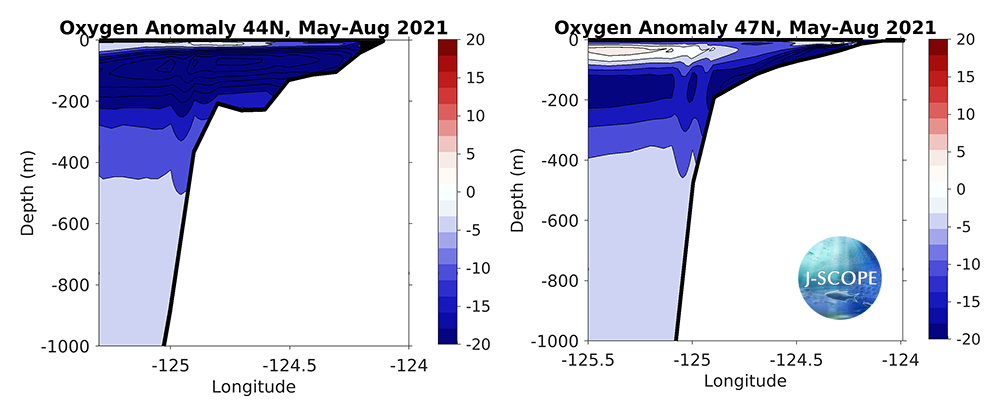 Finally, climatological cross-sections from the Newport Line in Oregon (44°N) and the Grays Harbor Line in Washington (47°N) are compared to the forecast average of the ensemble members during the summer upwelling season (May - August). In both Oregon and Washington, the forecast projects that the oxygen concentration for the upwelling season of 2021 will be lower than the climatology on both the shelf and at deeper depths. The largest negative anomalies are forecast to occur between the surface and ~400 m depth in both Oregon and Washington.