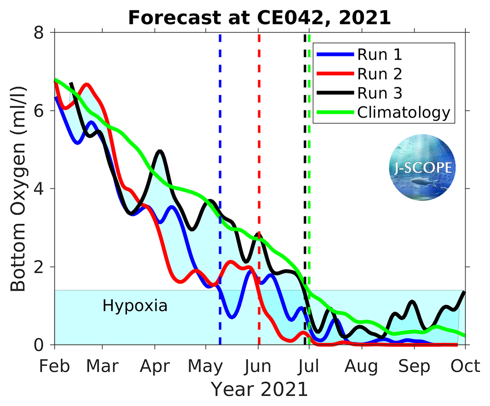 Time series of bottom oxygen from the Washington coast near one of the Olympic Coast National Marine Sanctuary (OCNMS) moorings at Cape Elizabeth (site CE042), from NH-10 mooring off of Newport, Oregon, and from the Ćháʔba· mooring off of La Push, Washington, are shown for each member of the ensemble. The model forecasts that hypoxia will most likely develop at all three moorings - but most likely at the NH-10 mooring - before the climatological onset of hypoxia (green). Another time series from the outer Washington shelf, Ćháʔba·, forecasts hypoxia is unlikely for this location, but one of the three ensemble members forecasts hypoxia will set in here in July.