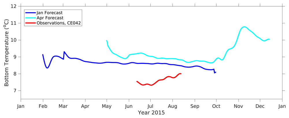 SST was biased high throughout the summer for the 2015 April forecast compared to the observations at the OCNMS Cape Elizabeth mooring; in August the forecast was approximately 8 deg C too warm. The January forecast was ~2-3 deg C warmer than the observations in July and August, but forecasted the SST very well in July. Forecasted bottom temperatures were also biased warm by 1-2 deg C at the same mooring.