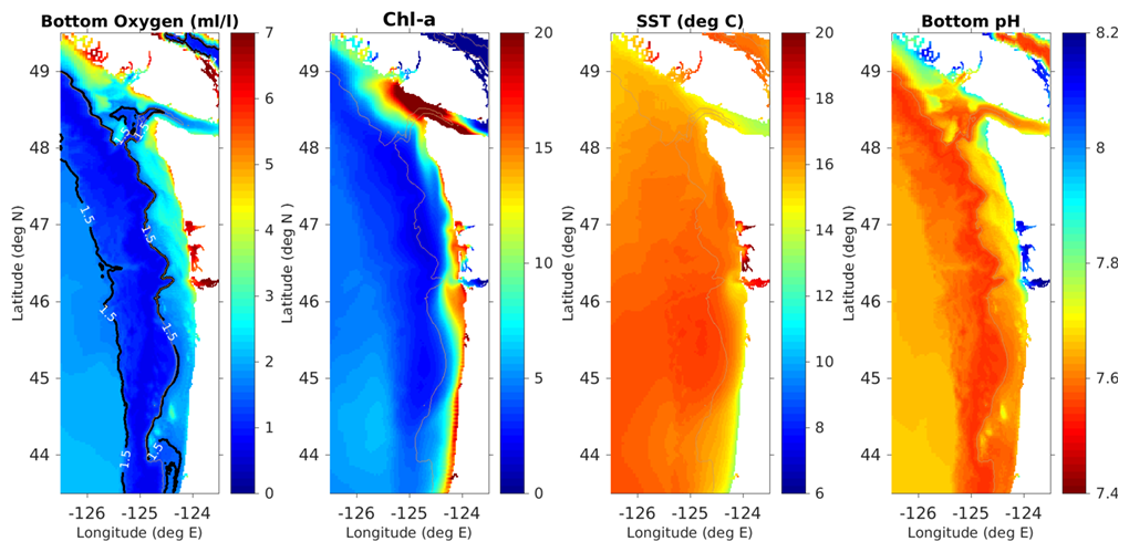 The model climatology spanning May - August for the upwelling season. More information about the three panels above can be found by navigating the Chlorophyll, SST, and Oxygen tabs above. The gray contour indicates the 200m isobath (shelf break) and the black contours on the bottom oxygen panel (left) indicate near hypoxic (1.5 ml/l) oxygen levels. The panel on the far right depicts the bottom water pH over the forecast period. The pH field is calculated using an empirical relationship established by Alin et al., in prep. This work is part of a collaboration between Samantha Siedlecki, J-SCOPE, and the Ocean Acidification group at NOAA PMEL.