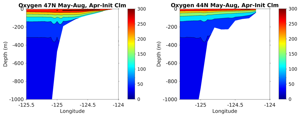 April-initialized model reforecast climatology spanning 2009 - 2017 for oxygen (umol/kg) from two cross sections (longitude vs depth) from the Washington shelf (Cape Elizabeth ~47 N) (left) and Oregon shelf (Heceta Bank ~44N) (right). The cross sections are averaged over the upwelling season (May - August).