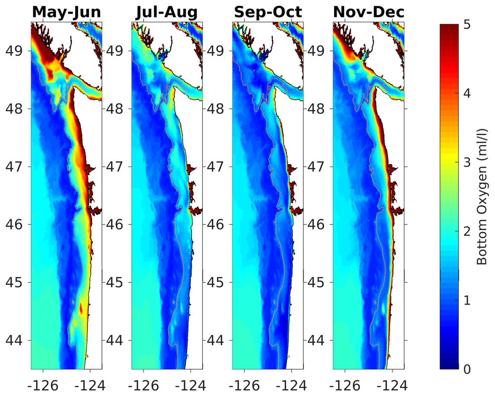 April-initialized model reforecast climatology spanning 2009 - 2017 for bottom oxygen (ml/l) of the model domain. Each panel details a two month average; some months are omitted due to low sample size. The 200 meter isobath (the shelf break) is highlighted for reference.