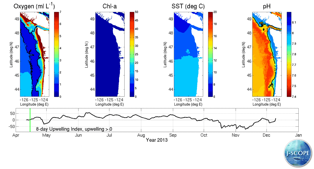 The J-SCOPE forecast system for Washington and Oregon coastal waters presents preliminary results for the 2013 upwelling season. The system predicts the timing of the spring transition, the cumulative upwelling index, sea-surface temperature (SST), primary production, chlorophyll stock, dissolved oxygen, and sardine habitat. All of these fields are reported as monthly averaged anomalies from regional climatologies (Venegas et al, 2008; Pierce et al, 2012; Crawford and Pena, 2013). These predicted quantities are key indicators for the California Current IEA report.