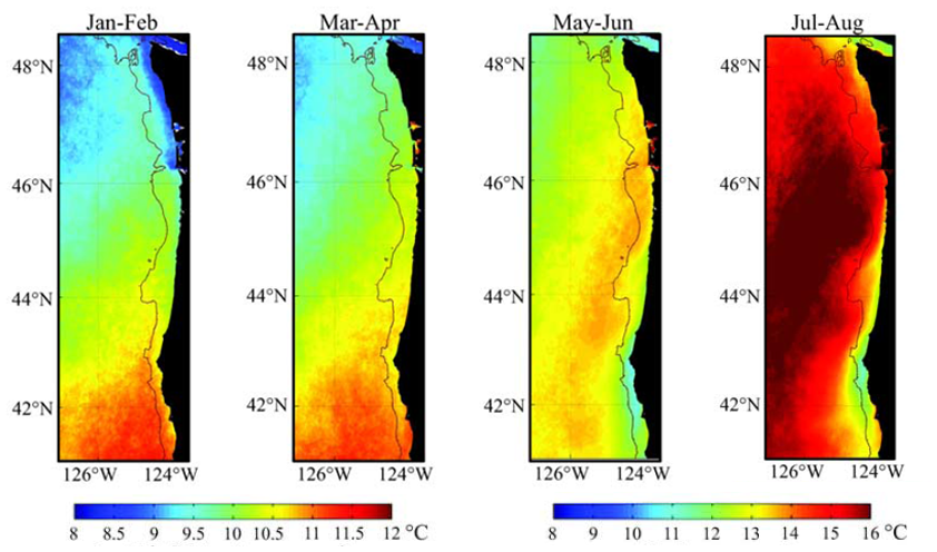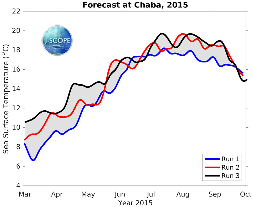 The SST was forecast using all three model runs of the ensemble for two point locations where buoys exist, Ćháʔba· off La Push, WA, and NH-10 off Newport, OR, are shown at the bottom of the page.