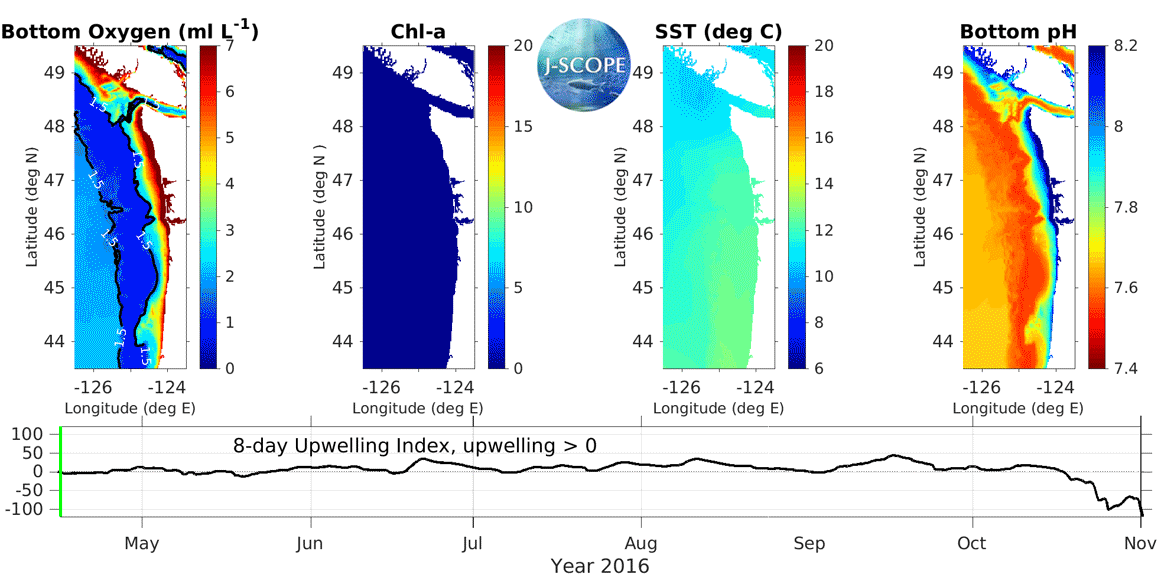 The movie above shows the J-SCOPE forecast for 2016, from ensemble model run #2 initialized on April 15. More information about the three panels on the left can be found by navigating the Chlorophyll, SST, and Oxygen tabs above. The panel on the far right depicts the evolution of bottom water pH over the forecast period. The pH field is calculated using an empirical relationship established by Alin et al., in prep. This work is part of a collaboration between Samantha Siedlecki, J-SCOPE, and the Ocean Acidification group at NOAA PMEL. The 8-day upwelling index is calculated using the method described in Austin and Barth (2002) and can also be found under the California Current Indicators tab above.