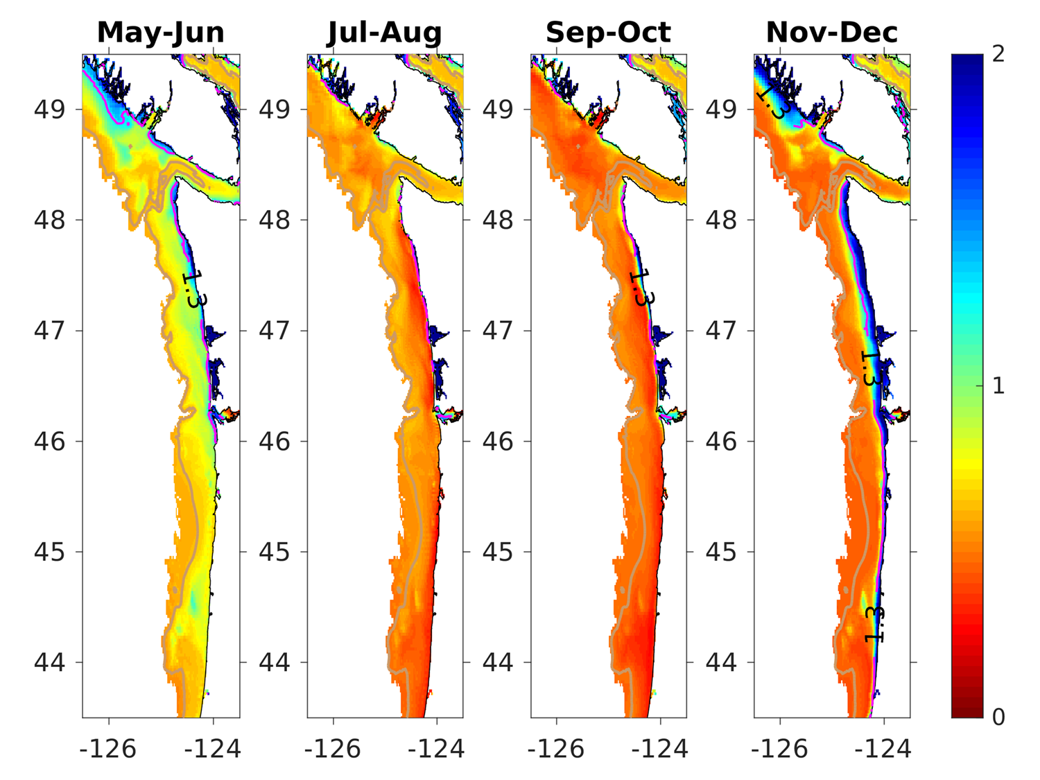 The modeled region surface aragonite saturation state (Ω) averaged over all three ensemble members and in time for (from left to right) May - June, July - August, September - October, and November - December. For reference, Ω=1 is the physical chemistry defined boundary between undersaturated and saturated conditions. Stressful conditions for juvenile oysters (Ω=1.3) is outlined by the pink contour.
