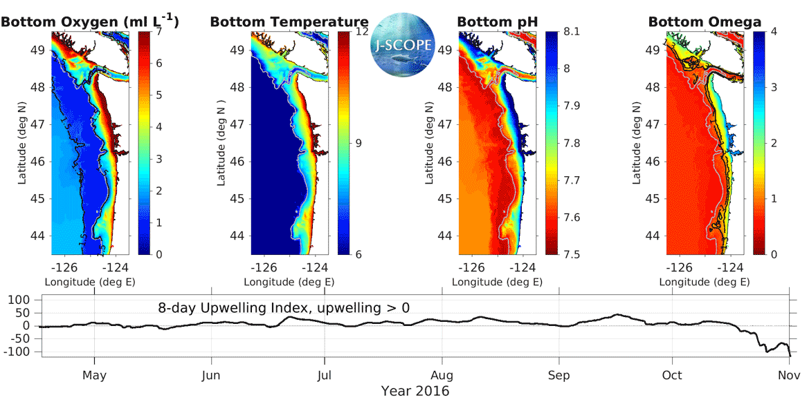 The movie above shows the J-SCOPE forecast for 2016, from ensemble model run #2 initialized on April 15. The 8-day upwelling index is calculated using the method described in Austin and Barth (2002) and can also be found under the California Current Indicators tab above.