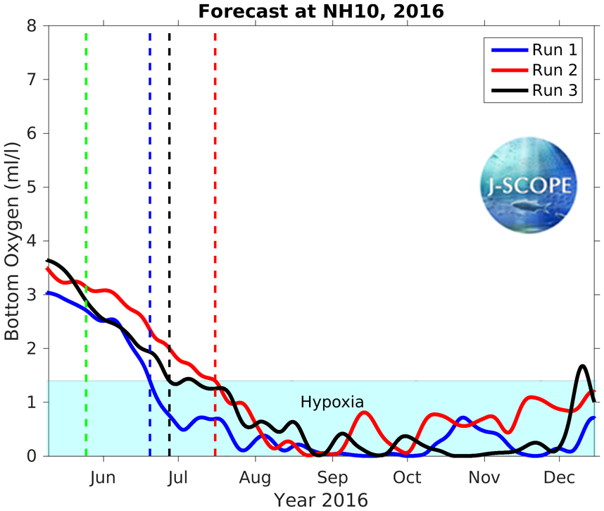 The emergence in anoxia in the model is caused by a bias associated with the lack of relaxations in the winds (found to be important in a paper by Adams et al, 2013) in CFS as well as a bias in the short wave radiation (see 2013, Year in Review). The model does have skill in predicting the emergence and severity of hypoxia, while it is biased low for these reasons. Given the difficulty in predicting the fall transition in 2013 or 2014 (see 2013, Year in Review), the forecast for low oxygen levels forecasted well into September is highly uncertain.