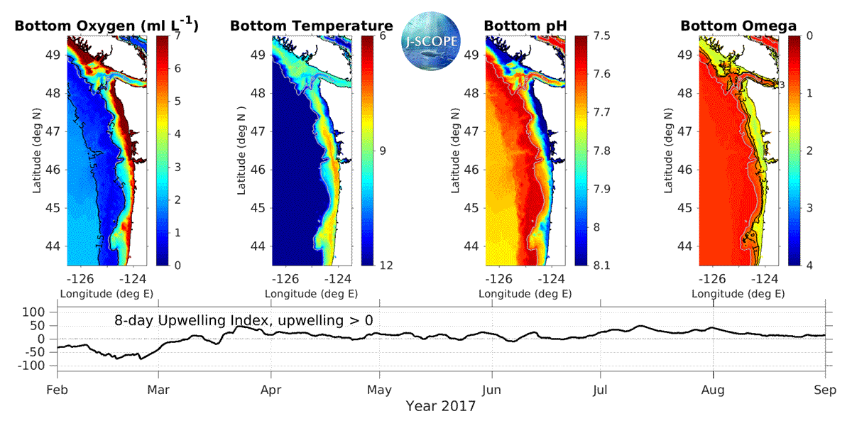 The J-SCOPE forecast system for Washington and Oregon coastal waters presents preliminary results for the ocean acidification conditions during the 2017 upwelling season. The forecast for 2017 is composed of three model runs that make up an ensemble. Each model run is initialized at a different time (January 5, January 15, January 25), and has complementary forcing files from the large scale model CFS.