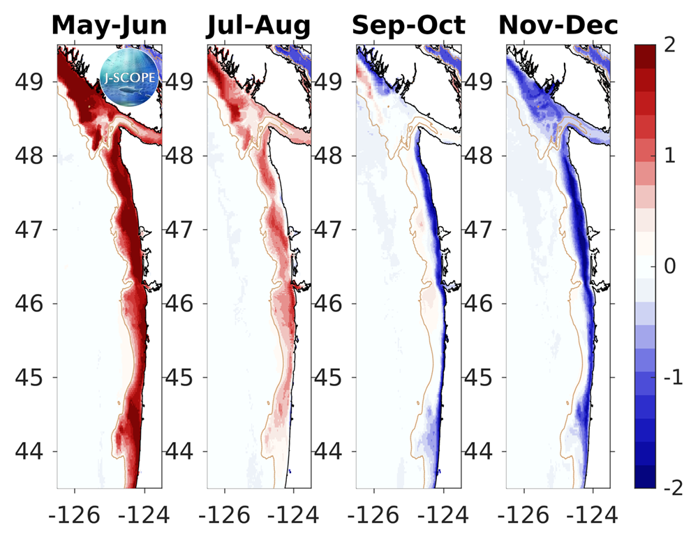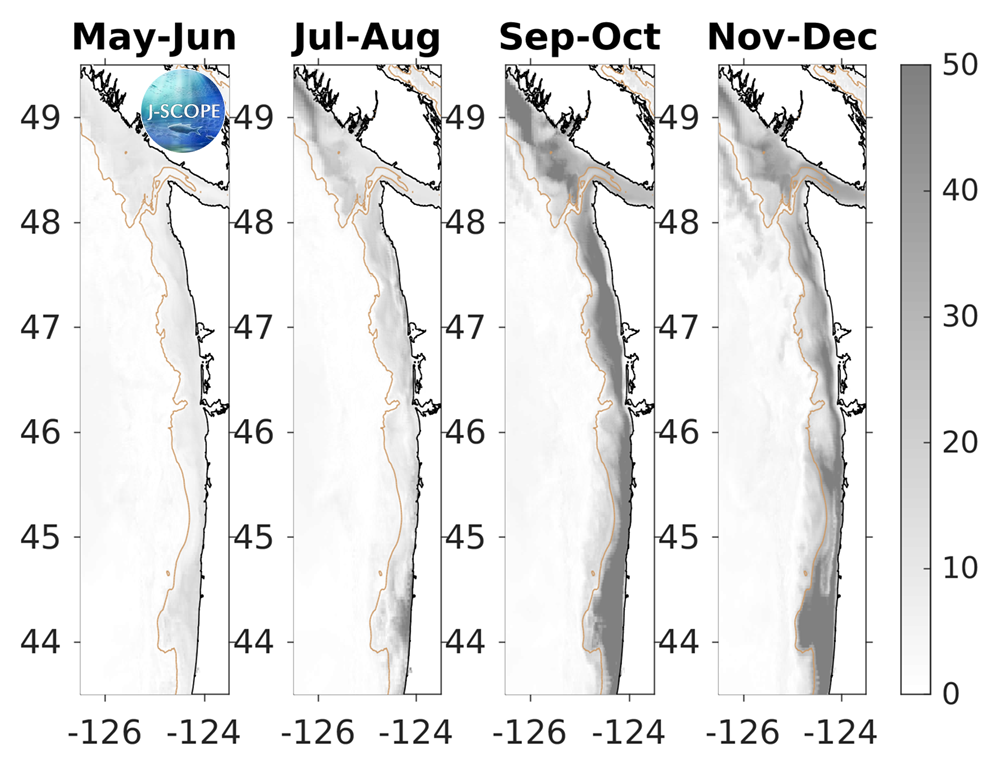 Finally, climatological cross-sections from the Newport Line in Oregon (44°N) and the Grays Harbor Line in Washington (47°N) are compared to the forecasted average of the ensemble members during the summer upwelling season (May - August). In Oregon, the forecast projects that the oxygen concentration for the upwelling season of 2017 will be higher than the climatology subsurface (>400 m depth) and lower than the climatology on the shelf (<200 m depth). In Washington, the forecast projects that the oxygen concentration for the upwelling season of 2017 will be higher than the climatology on the shelf (<200 m depth), but lower than the climatology at deeper depths (>500 m).