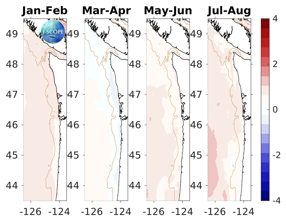 For waters off the Washington coast, the forecast projects that SST will be slightly warmer than climatology throughout the upwelling season, but SST is forecasted to be near or slightly cooler than climatology for shelf and offshore waters in March - April. The relative uncertainty is very low (<10%) for the entire forecast.
