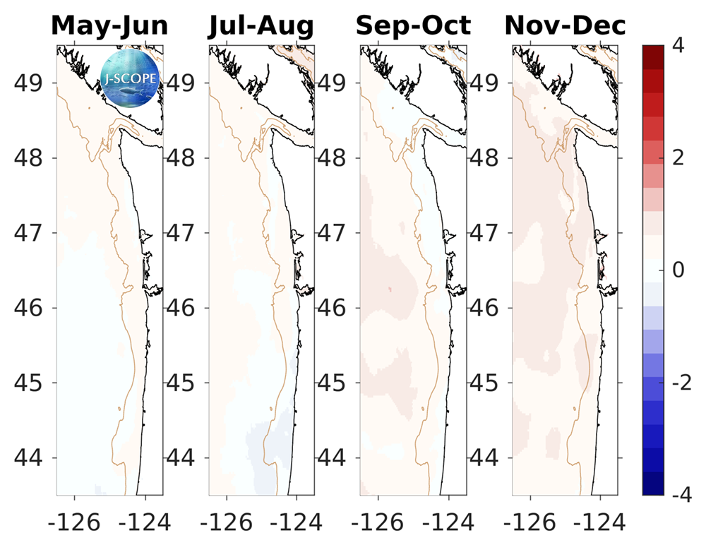 Finally, climatological cross-sections from the Newport Line in Oregon (44°N), as well as the Grays Harbor Line in Washington (47°N), are compared to the forecasted average of the ensemble members. The forecast projects that subsurface temperatures are projected to be near climatological in both Washington and Oregon.