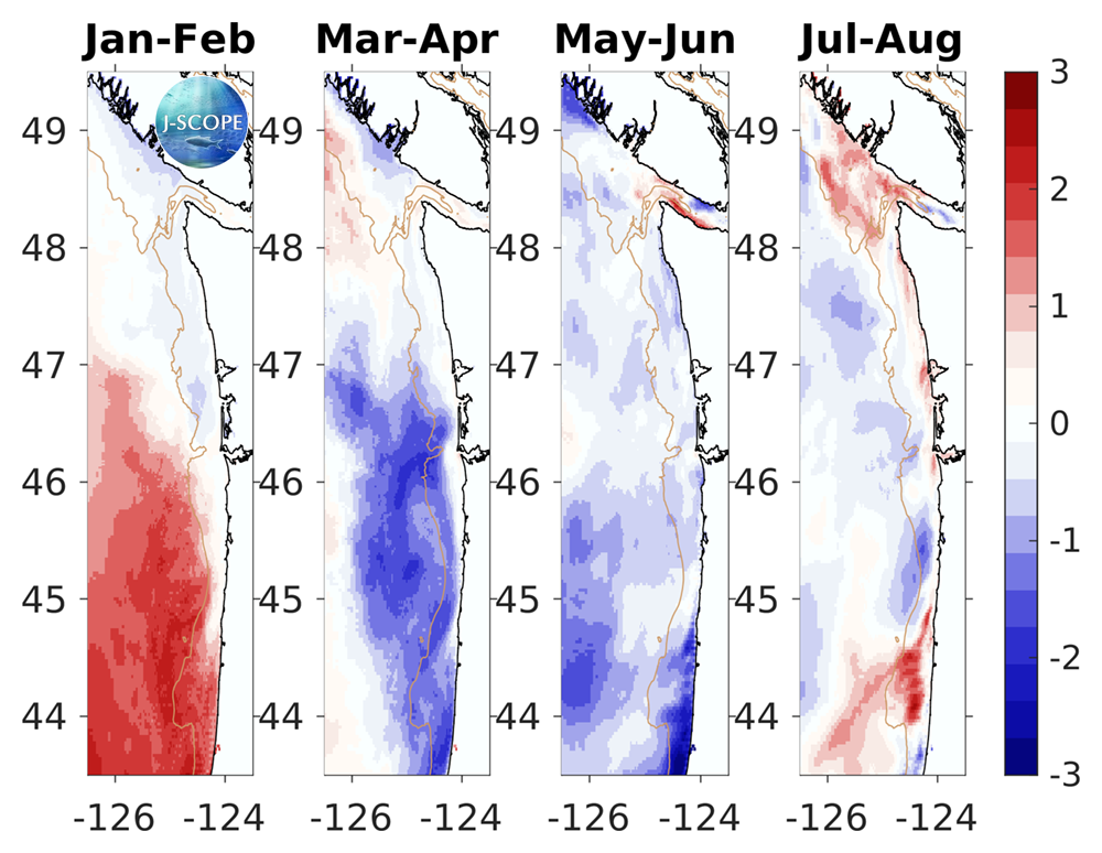 For waters off the Washington and Oregon coast, the forecast projects that 10-meter integrated chlorophyll will be slightly lower than climatology on the shelf and lower than climatology farther offshore at the beginning of the upwelling season (May - June). However, later in the upwelling season (July - August), shallow shelf waters will have higher chlorophyll than climatology while offshore waters will approach climatology. The relative uncertainty is highest at the beginning of the forecast when chlorophyll levels are low, but then decreases and remains relatively steady throughout the upwelling season.