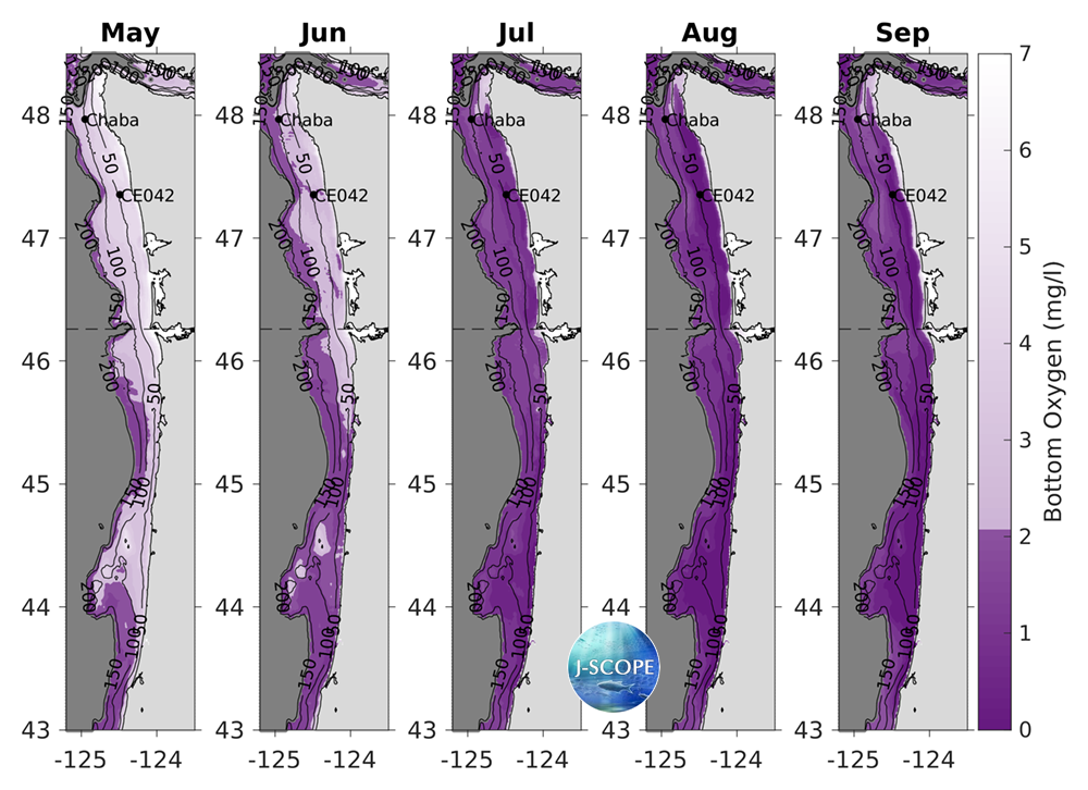 The modeled region bottom oxygen (mg/l) averaged over all three ensemble members and in time for (from left to right) May, June, July, August, and September. Hypoxia (O2 < 2 mg/l) is shown in dark purple, land is shown in light grey, and offshore areas are shaded dark gray. The black dashed line indicates the boundary between Washington and Oregon waters. Black contours indicate bathymetry on the shelf. Two mooring locations are plotted for reference (Ćháʔba·, CE042).