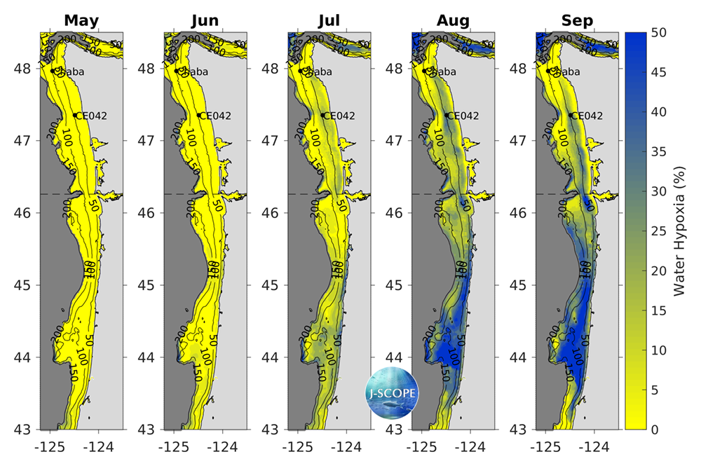 Hypoxia extends upward into the water column as well. The percentage of the water column that is forecasted to experience hypoxia (O2 < 2 mg/l) is a metric for this phenomenon. Early in the upwelling season, hypoxia is forecasted to occupy a small percentage of the water column over the entire modeled region (<10%). In July, some regions in Oregon, nearshore, and around Cape Elizabeth begin to experience more (~20%). Over the course of the summer, the percentage of the water column that is hypoxic increases coast-wide, with particularly high volumes forecasted for Heceta Bank on the Oregon shelf and around Cape Elizabeth in August and September with values of up to 50% of the water column experiencing hypoxia.