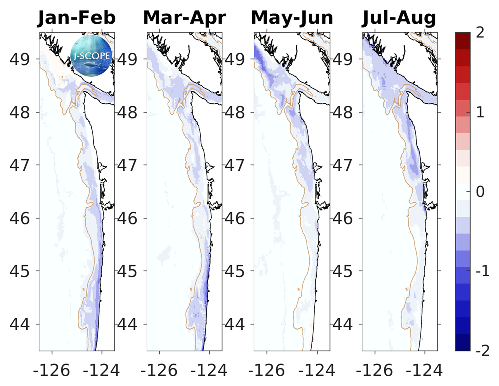 The modeled region bottom oxygen (ml/l) anomaly averaged over all three ensemble members and in time for (from left to right) January - February, March - April, May - June, July - August.