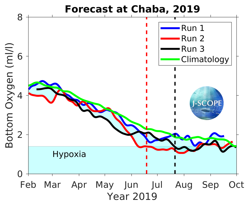 The emergence of anoxia in the model in late summer is caused by a bias associated with the lack of relaxations in the winds (found to be important in a paper by Adams et al, 2013) in the Climate Forecast System input files as well as a bias in the shortwave radiation (see 2013, Year in Review). The model does have skill in predicting the emergence and severity of hypoxia, while it is biased low for these reasons. Given the difficulty in predicting the fall transition in prior forecasts (see 2013, Year in Review), the forecast for low oxygen levels forecasted well into August is highly uncertain.