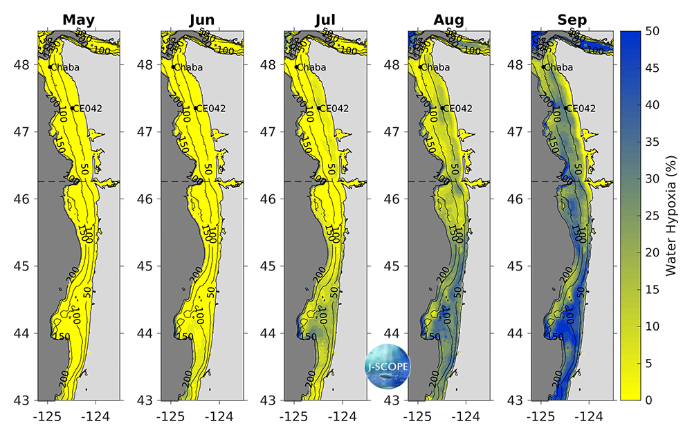 Hypoxia extends upward into the water column as well. The percentage of the water column that is forecasted to experience hypoxia (O2 < 2 mg/l) is a metric for this phenomenon. Early in the upwelling season, hypoxia is forecasted to occupy only a very small percentage of the water column over the entire modeled region (<10%). In July, much of the Oregon shelf, and a narrow swath near the Washington coast around Cape Elizabeth begin to experience more hypoxia (~20%). Over the course of the summer, the percentage of the water column that is hypoxic increases coast-wide, with particularly high volumes forecasted for Heceta Bank on the Oregon shelf and around Cape Elizabeth in August and September with up to 50% of the water column experiencing hypoxia.
