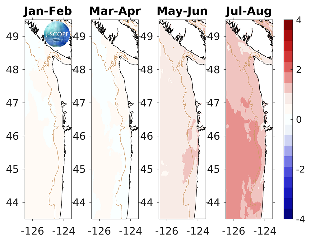 We note that the NANOOS Climatology App shows that the NDBC buoys along the Washington and Oregon shelf are recording sea surface temperatures warmer than the long-term averages since the start of 2020.