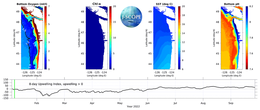 The J-SCOPE forecast system for Washington and Oregon coastal waters presents preliminary results for the 2022 upwelling season. The CFS forecast indicates the current La Nina (ENSO-negative) conditions are likely to persist through the Northern hemisphere spring (67% chance during March-May 2022) but then transition to ENSO-neutral conditions (~50% chance during April-June 2022). In comparison to the climatological data, coastal waters in the J-SCOPE domain during the summer upwelling season (May - August) are forecast to have temperatures near climatology in surface (SST) and subsurface habitats. Bottom oxygen is forecast to be lower over the Washington and Oregon continental shelves early in the upwelling season with the shelves trending toward near climatological values later in the upwelling season with high disagreement between ensemble members at the end of the upwelling season. Chlorophyll concentrations vary spatially and temporally but are forecast to be lower than climatological values early in the upwelling season, especially on the Oregon continental shelf, but trending toward near climatological values over the shelves later in the upwelling season; regions associated with the Juan de Fuca Eddy and the mouth of the Columbia River are forecast to experience higher than average chlorophyll. Bottom Ω is forecast to be undersaturated throughout the upwelling season, with the exception of supersaturated conditions for nearshore regions within the Olympic Coast National Marine Sanctuary and some coastal embayments on the Washington shelf. Surface Ω is forecast to be supersaturated throughout the upwelling season for all coastal areas.