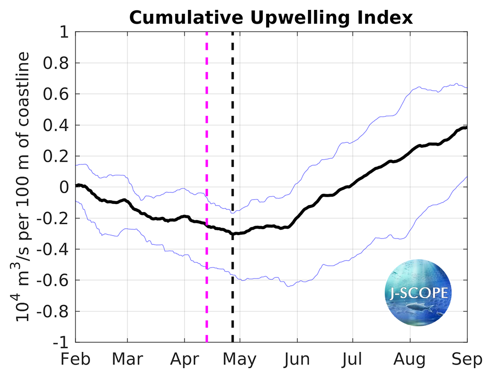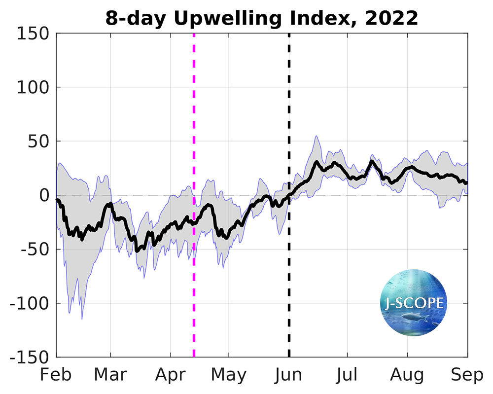 - Regional Upwelling Indices which drive local primary production: The wind product reported here is the 8-day Upwelling Index. The average of all three model runs making up the ensemble is plotted as a solid line with the range of ensemble runs shown as a gray cloud around the line. The upwelling season is forecast to begin on the 1st day of June (black line), which is later than the climatological average of April 13th (pink line).