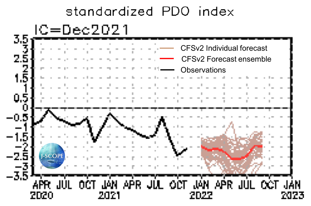 - Pacific Decadal Oscillation: The January 2022 CFS forecast suggests negative PDO conditions will continue in the summer of 2022.