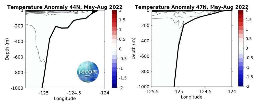 The modeled cross-section from the Newport Line (left, 44°N) and the Grays Harbor Line (right, 47°N), averaged over all three ensemble members, and averaged over the summer upwelling months (May - August). These cross-sections are anomalies from the January-initialized reforecast climatology.