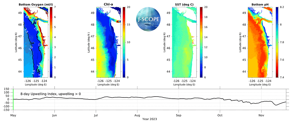 The movie above shows the J-SCOPE forecast for 2023, from ensemble model run 1 initialized on April 5. More information about the three panels on the left can be found by navigating the Oxygen, Chlorophyll, and Sea Surface Temperature tabs above. The panel on the far right depicts the evolution of bottom water pH over the forecast period. The 8-day upwelling index is calculated using the method described in Austin and Barth (2002) and can also be found under the California Current Indicators tab above.