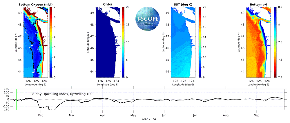 The J-SCOPE forecast system for Washington and Oregon coastal waters presents preliminary results for the 2024 upwelling season. Although a El Niño was apparent during January, the CFS forecast indicates ENSO-neutral conditions are expected to begin in late spring, and transition to a La Niña over the course of the summer. In comparison to the climatological data, during the summer upwelling season (May - August), coastal regions are forecasted to have higher sea surface temperatures (SST) with the warm anomalies extending subsurface but with bottom temperatures over much of the shelf remaining near climatological along both 47°N and 44°N. Bottom oxygen is forecasted to be lower over both the Washington Oregon shelves with subsurface oxygen anomalies extending down the slope regions. Hypoxia is forecasted earlier than climatological (in late May, early June) at both CEO42 and NH10. Chlorophyll concentrations vary spatially but are forecasted to be lower on the early portion of the upwelling season and higher over latter portion. Bottom Ω is forecasted to be undersaturated throughout the upwelling season, with the exception of supersaturated conditions on shallow nearshore Washington shelves. Surface Ω is forecasted to be supersaturated throughout the upwelling season for all coastal areas.
