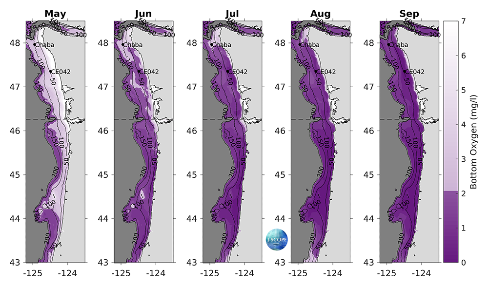 Forecasted bottom oxygen (mg/l), averaged over three ensemble members for each month, indicates declines in oxygen concentrations over the course of the forecast for both Washington and Oregon, with hypoxia (O2 < 2 mg/l) prominent over about the outer shelf of Oregon in May and expanding to much of the entire Washington and Oregon shelves in June and persisting through September eventually overtaking the typically normoxic region at the northern boundary of the Washington shelf around Ćháʔba·.