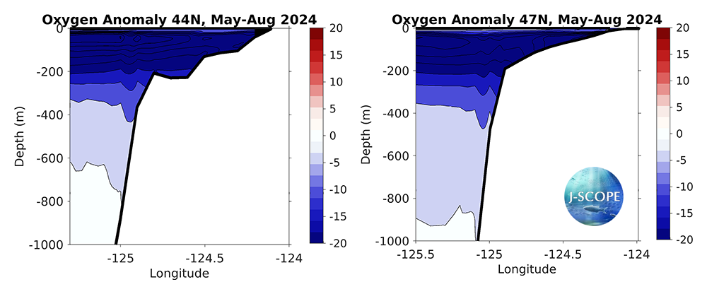 Finally, climatological cross-sections from the Newport Line in Oregon (44°N) and the Grays Harbor Line in Washington (47°N) are compared to the forecasted average of the ensemble members during the summer upwelling season (May-August). In both Oregon and Washington, the forecast projects that the oxygen concentration for the upwelling season of 2024 will be lower than the climatology on both the shelf and at deeper depths, with the largest anomalies occurring between ~50 m and ~300 m depth in Oregon, and ~50 m and 250 m depth in Washington.