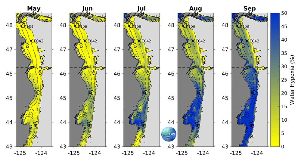 The modeled region water column hypoxia (%) averaged over all three ensemble members and in time for (from left to right) May, June, July, August, and September. Land is shown in light grey, and offshore areas are shaded dark gray. The black dashed line indicates the boundary between Washington and Oregon waters. Black contours indicate bathymetry on the shelf. Two mooring locations are plotted for reference (Ćháʔba·, CE042).
