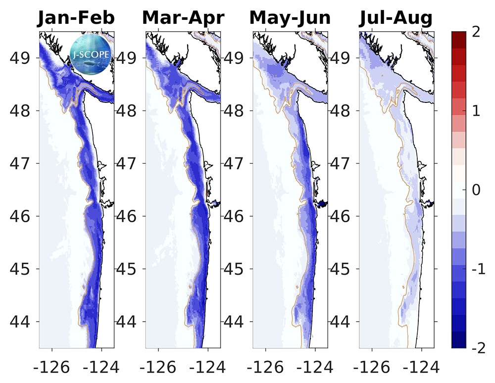 Forecasted bottom oxygen (mg/l), averaged over three ensemble members for each month, indicates declines in oxygen concentrations over the course of the forecast for both Washington and Oregon, with hypoxia (O2 < 2 mg/l) prominent over most of the Oregon shelf in May and expanding to much of the Washington shelf in June and persisting through September eventually overtaking the typically normoxic region at the northern boundary of the Washington shelf around Ćháʔba·.