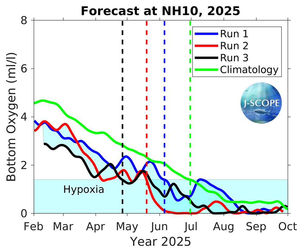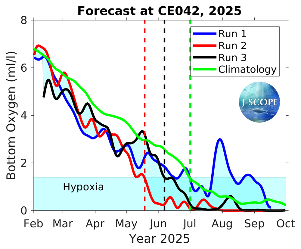 Time series of bottom oxygen from the Washington coast near one of the Olympic Coast National Marine Sanctuary (OCNMS) moorings at Cape Elizabeth (site CE042), from NH-10 mooring off of Newport, Oregon, and from the Ćháʔba· mooring off of La Push, Washington, are shown for each member of the ensemble. The model forecasts that hypoxia will most likely develop at all three moorings - but more likely at the NH-10 and CE042 moorings in late May/early June, which is more than one month before the climatological onset of hypoxia (green). Another time series from the outer Washington shelf, Ćháʔba·, forecasts hypoxia onset in July is unusual for this location and there is not typically hypoxia observed at this location.