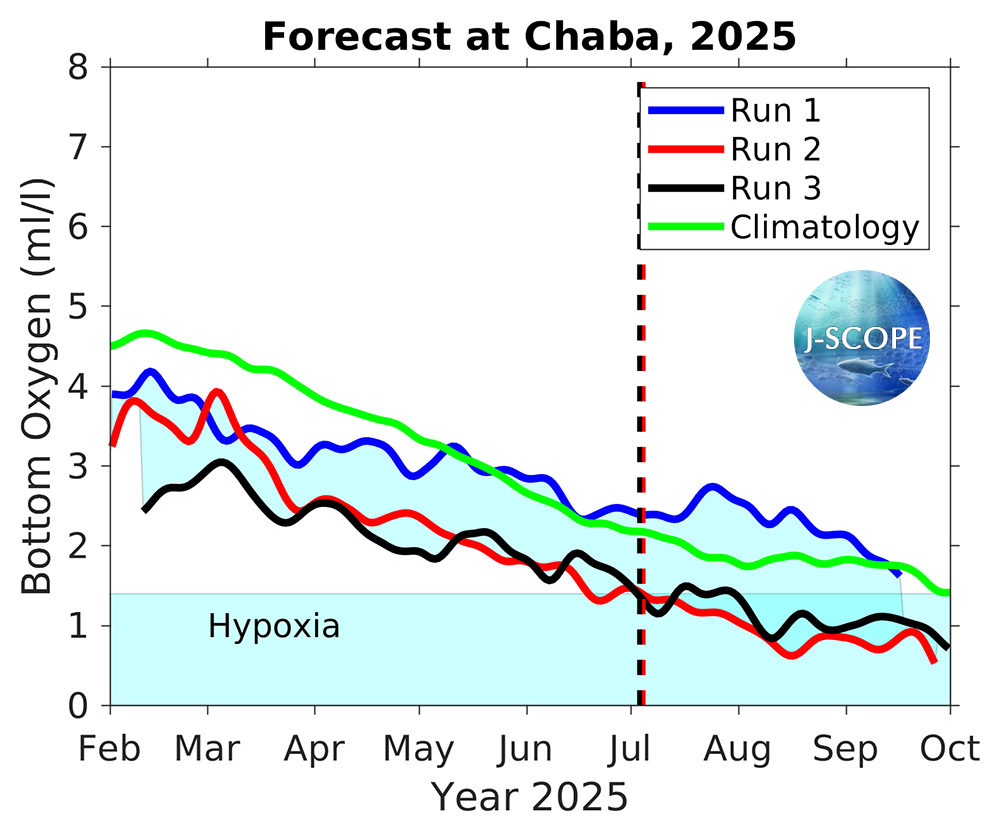 The emergence of anoxia in the model in late summer is caused by a bias associated with the lack of relaxations in the winds (found to be important in a paper by Adams et al, 2013) in the Climate Forecast System input files as well as a bias in the shortwave radiation (see 2013, Year in Review). The model does have skill in predicting the emergence and severity of hypoxia, while it is biased low for these reasons. Given the difficulty in predicting the fall transition in prior forecasts (see 2013, Year in Review), the forecast for low oxygen levels forecasted well into August is highly uncertain.