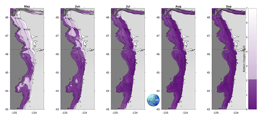 Forecasted bottom oxygen (mg/l), averaged over three ensemble members for each month, indicates declines in oxygen concentrations over the course of the forecast for both Washington and Oregon, with hypoxia (O2 < 2 mg/l) prominent over most of the Oregon shelf and other shelf in Washington in May and expanding to nearly all of the Washington shelf in July and persisting through September eventually overtaking the typically normoxic region at the northern boundary of the Washington shelf around Ćháʔba·.