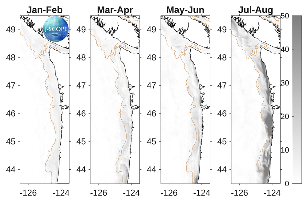Hypoxia extends upward into the water column as well. The percentage of the water column that is forecasted to experience hypoxia (O2 < 2 mg/l) is a metric for this phenomenon. Early in the upwelling season, hypoxia is forecasted to occupy a small percentage of the water column over the entire modeled region (<10%). In July, some regions in Oregon, begin to experience more than ~20%. Over the course of the summer, the percentage of the water column that is hypoxic increases coast-wide, with particularly high volumes forecasted for Heceta Bank on the Oregon shelf in August and September with values exceeding 50% of the water column experiencing hypoxia.