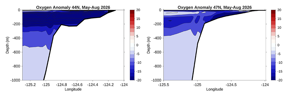 Finally, climatological cross-sections from the Newport Line in Oregon (44°N) and the Grays Harbor Line in Washington (47°N) are compared to the forecasted average of the ensemble members during the summer upwelling season (May - August). In both Oregon and Washington, the forecast projects that the oxygen concentration for the upwelling season of 2026 will be lower than the climatology on both the shelf and at deeper depths, with the largest anomalies occurring between ~50 m and ~250 m depth in Oregon, and ~50 m and 200 m depth in Washington.