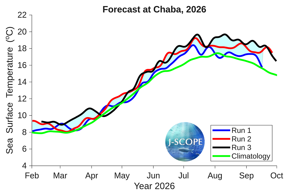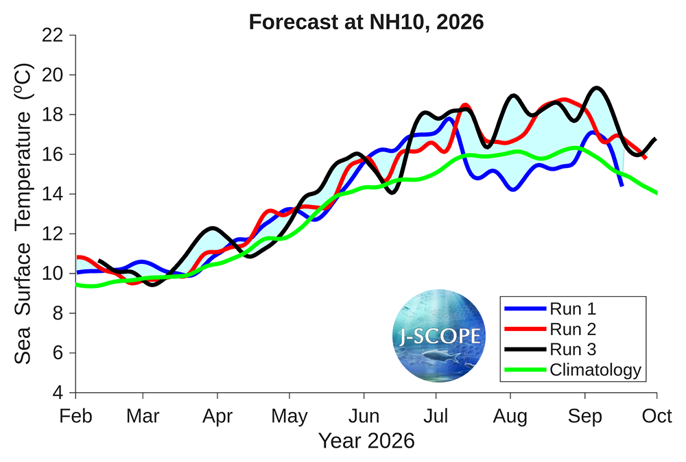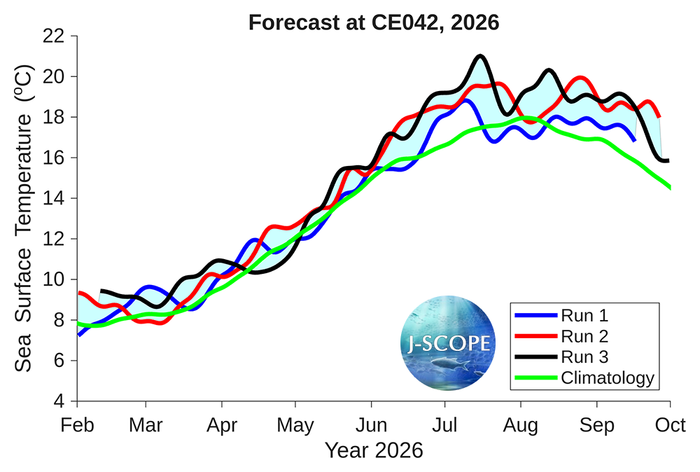 The SST was forecast using all three model runs of the ensemble for three point locations where buoys exist, Ćháʔba· off La Push, Washington, NH-10 off Newport, Oregon, and CE042 in the Olympic Coast National Marine Sanctuary, are shown below. All three indicate slightly warmer SSTs than the climatology over most of the upwelling season. The forecast at both Ćháʔba· off La Push and CE042 in the OCNMS resides warmer with highest forecasted SSTs than NH-10 off Newport, Oregon.