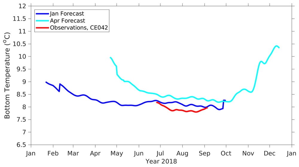 Sea temperature forecasts compared to the Cape Elizabeth 42m station observations.