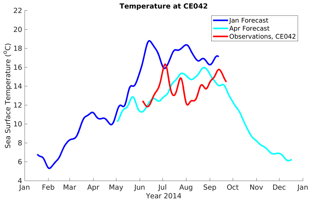 SST was biased high throughout the summer for the 2014 January forecast compared to the observations at the OCNMS Cape Elizabeth mooring; in August the forecast was approximately 7 degrees too warm. The April forecast was ~4 degrees cooler than the observations in July but warmer than the observations by ~2-3 degrees during July - September. The late upwelling season is when the forecast performed the worst, as previously discussed, due to the biases in the winds and radiation from CFS. Forecasted bottom temperatures were also biased warm by 0.5-0.75 deg C at the same mooring.