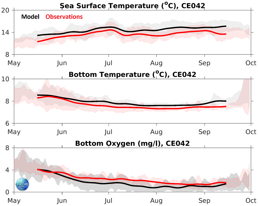 Time series of the observational climatology (red) from the OCNMS mooring location, CE042, off the Washington shelf in 42 m of water. The model climatology (black) is the average of the 2009 - 2014 hindcasts. The time series have been smoothed with a 30-day filter. The standard deviation around each climatology is shaded in the background. Observations are in red and the model is in black. (top) SST, (middle) bottom temperature, and (bottom) bottom oxygen (mg/l).