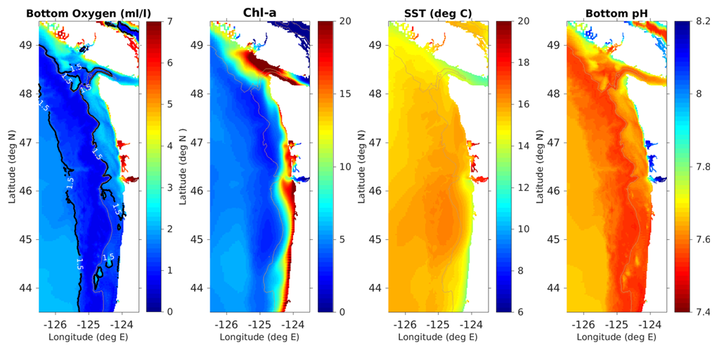 The model climatology spanning May - August for the upwelling season. More information about the three panels above can be found by navigating the Chlorophyll, SST, and Oxygen tabs above. The gray contour indicates the 200m isobath (shelf break) and the black contours on the bottom oxygen panel (left) indicate near hypoxic (1.5 ml/l) oxygen levels. The panel on the far right depicts the bottom water pH over the forecast period. The pH field is calculated using an empirical relationship established by Alin et al., in prep. This work is part of a collaboration between Samantha Siedlecki, J-SCOPE, and the Ocean Acidification group at NOAA PMEL.