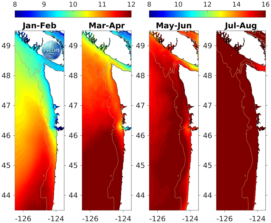 J-SCOPE forecast results for the simulation beginning in February of 2015 are shown in the first figure below. Each panel represents a two-month average for the region averaged over three model runs of the ensemble . January through April has a different color bar than May through August. The regional climatology from Venegas et al, 2008 is provided directly below the forecast plots for reference, although it covers a slightly larger area than the modeled domain. The panels directly under the climatology depict the relative uncertainty from the ensemble for the same time period.