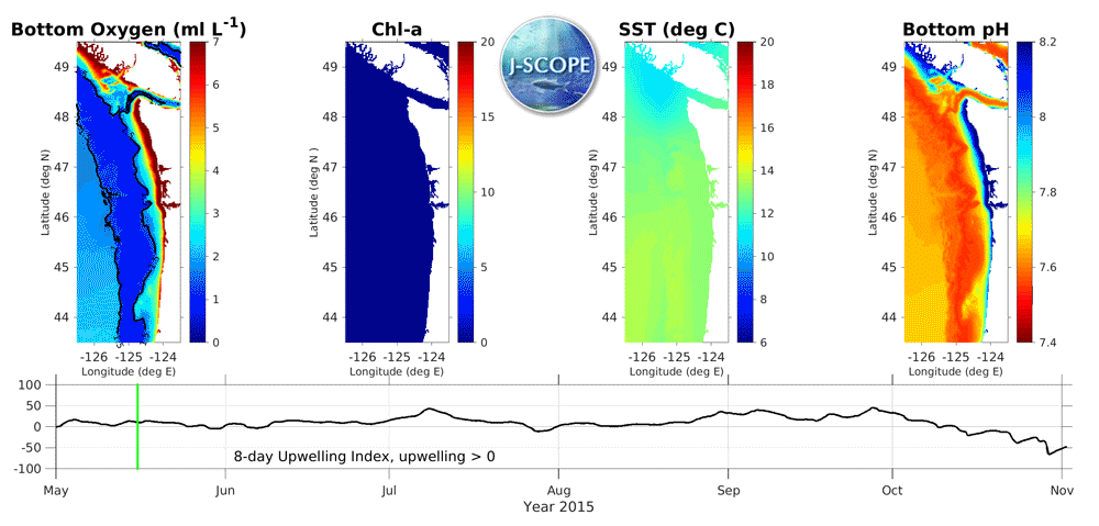 The movie above shows the J-SCOPE forecast for 2015, from ensemble model run #3 initialized on April 15. More information about the three panels above can be found by navigating the Chlorophyll, SST, and Oxygen tabs above. The panel on the far right depicts the evolution of bottom water pH over the forecast period. The pH field is calculated using an empirical relationship established by Alin et al., in prep. This work is part of a collaboration between Samantha Siedlecki, J-SCOPE, and the Ocean Acidification group at NOAA PMEL. The 8-day upwelling index is calculated using the method described in Austin and Barth (2002) and can also be found under the California Current Indicators tab above.