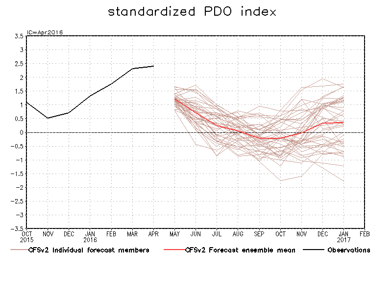 - Pacific Decadal Oscillation The April 2016 CFS forecast suggests a continuation of the positive phase of the PDO conditions into 2016 trending toward more neutral conditions over the summer with a possible reversal in August of 2016.