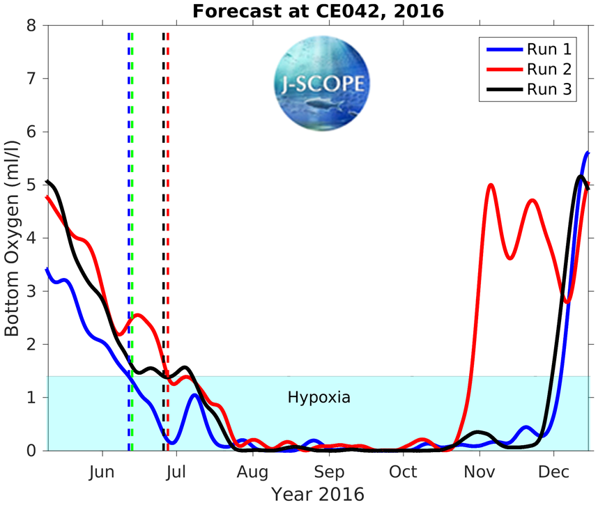 Finally, climatological cross-sections from the Newport Line in Oregon, as well as the Grays Harbor Line in Washington, are compared to the forecasted average of the ensemble members. The forecast projects that the oxygen concentration for the upwelling season of 2016 will be higher than the climatology.