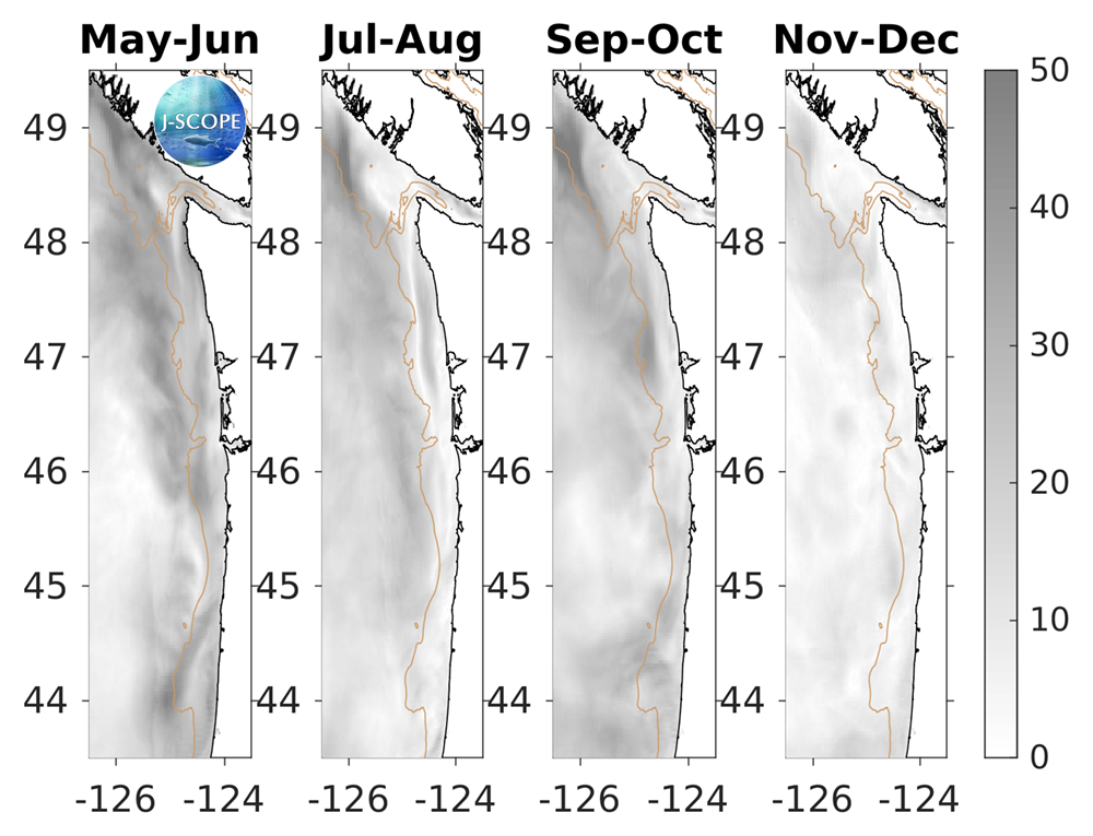 For waters off the Washington coast, the forecast projects that 10-meter integrated chlorophyll will be lower than climatology during the summer upwelling season (May - June, July - August) on the shelf, but will show a relative increase near shore in the fall (September - October, November - December). The relative uncertainty is highest near the shelf break throughout the summer and early fall (May - June, July - August, September - October).